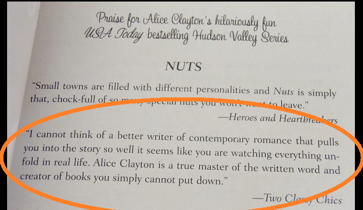 To me, there is no better way to relax than to curl up with a cup of coffee and a fabulous read. That is why I love reviewing books so much. It feeds my soul. So imagine my surprise and pleasure that my addiction has been recognized with this awesome quote from my review of NUTS, published on my old blog (and GoodReads among other places), that is now located inside of Alice Clayton’s new novel, Cream of the Crop. I am fan-girling here, just a wee bit.