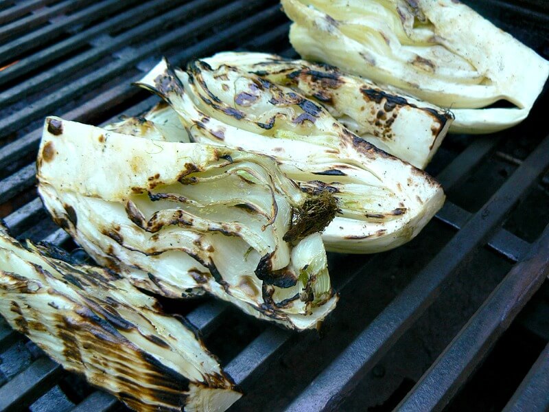 Place on grill at medium heat to sear the fennel. Move to indirect heat, with the cut side up, and cook covered for about 45 minutes or until fennel is very soft. You can tell when it’s done by texture, rather than time. You definitely want to make sure it’s tender.