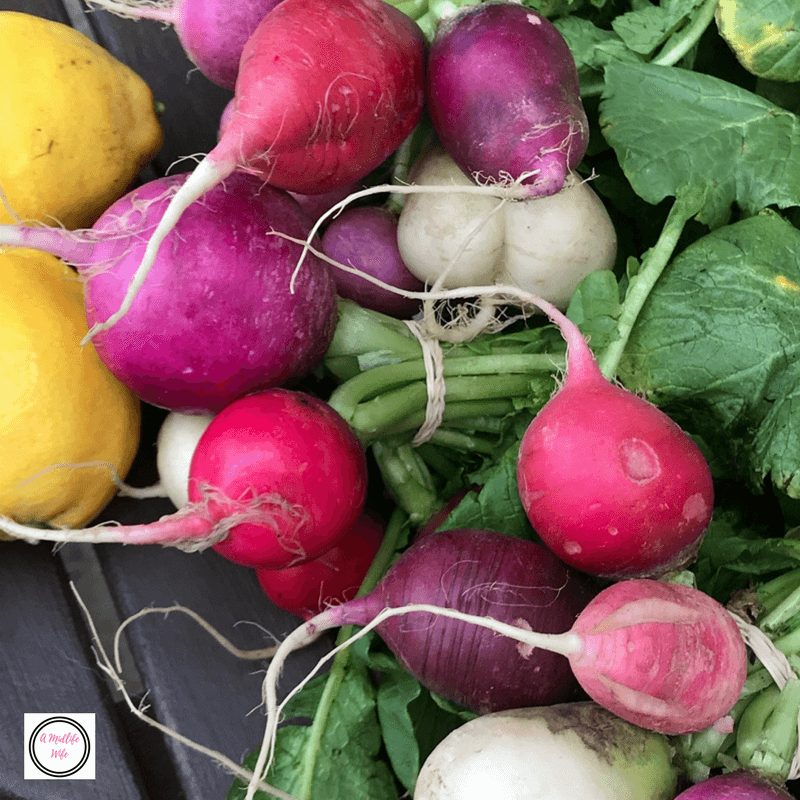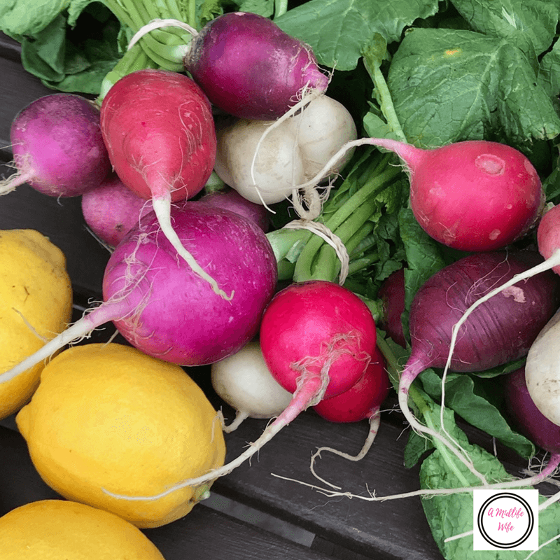So I scooped up the last three bunches of these amazing and delicious Easter variety radishes. Gloriously colorful and crisp with a bite of delicious taste, perfect for snacking. Plus, I also added some fresh lemons since my lemon tree didn’t produce very good ones this year. Perfect for making lemon water each morning.