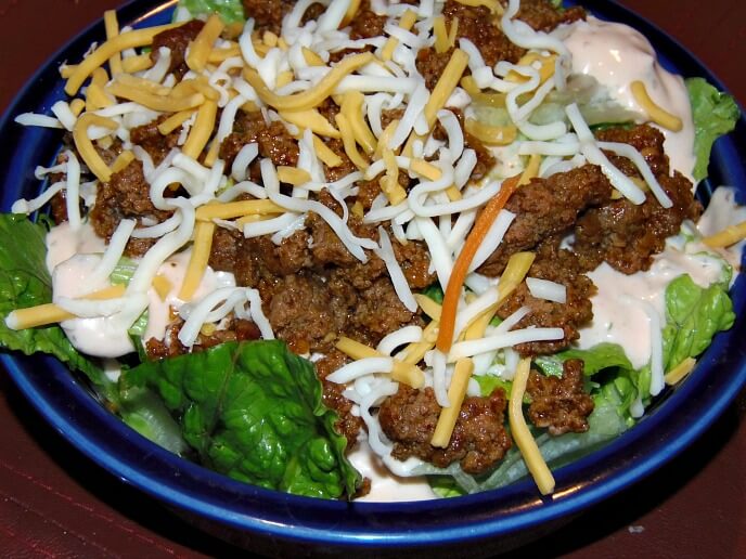 You can mix all of this together in one large bowl or serve it all separately for your family to assemble as they choose. This is delicious with a simple Taco Sauce, like La Victoria, as your dressing or your can choose a low-sugar Thousand Island or your favorite salsa. Your choice.